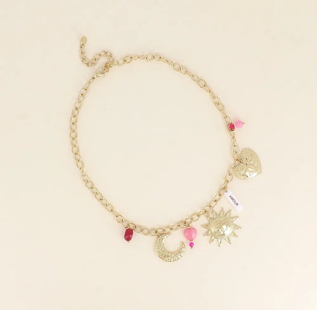 Jolie collier avec charm amour rose soleil lune coeur en acier inoxydable